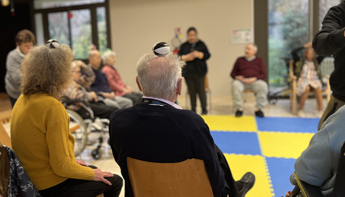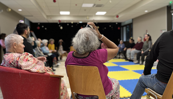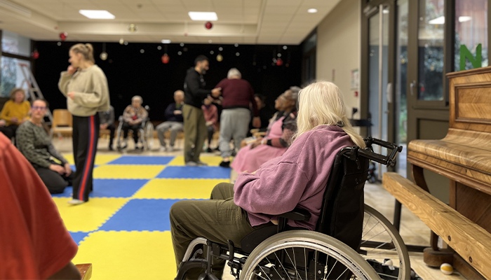 Alors que les intervenant·es déchargent le camion, les résident·es sont déjà toutes et tous assis·es en cercle, dans une salle où scintillent les décorations de Noël.