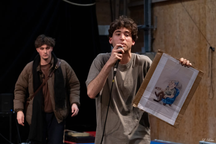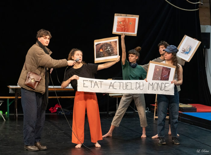 Le premier spectacle, encadré par Françoise Lepoix intervenante en écriture dramaturgique, s'est construit autour d'objets personnels que chaque apprenti·es avaient pour consigne d'apporter : une image décrivant l’état du monde, une chanson marquante, une image d’une personne âgée.