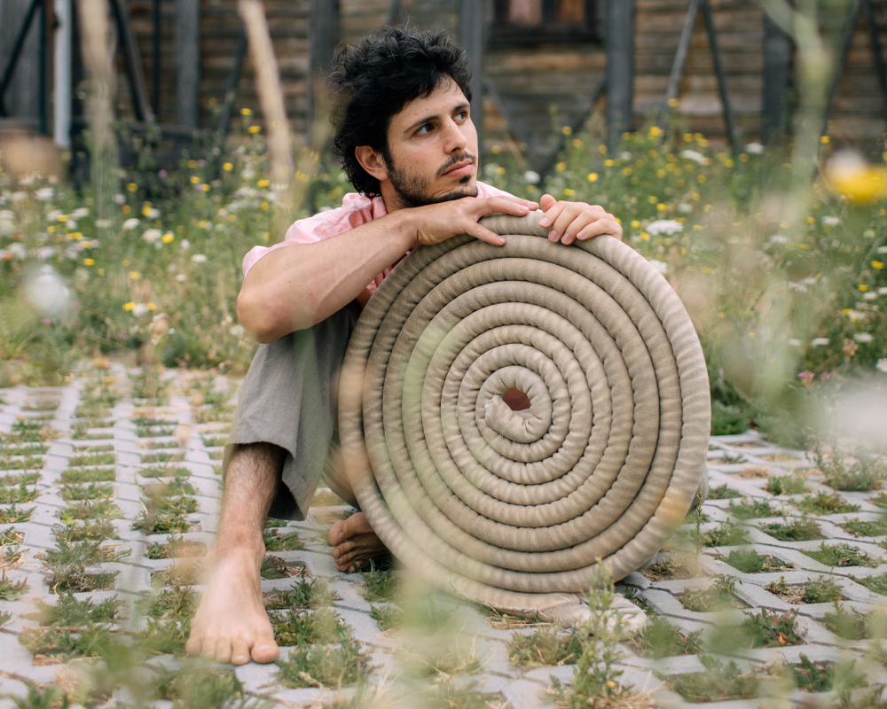 Sagi est une personne instable, et c’est pour ça que, depuis toujours, il cherche l’équilibre : l’équilibre sur les mains et l’équilibre sur la tête, mais il finit toujours par tomber.