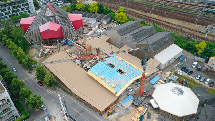 Entre mai et juillet, la toiture de la Halle a été posée et les bandes vitrées hautes latérales ont été installées.