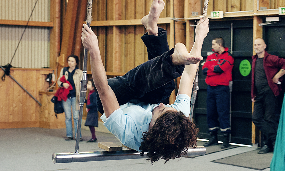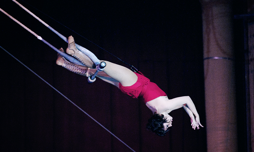 L’artiste fait des acrobaties sur le trapèze qui fait de grands mouvements de balancier.