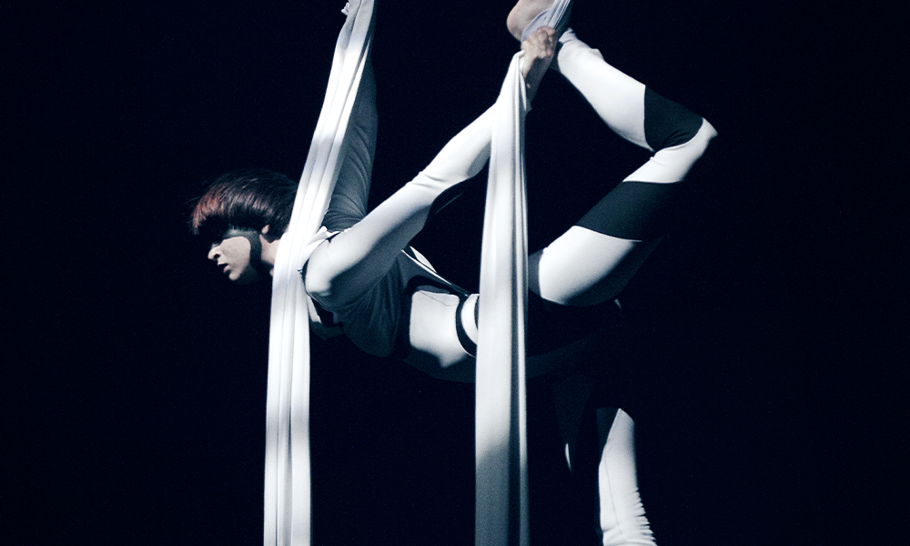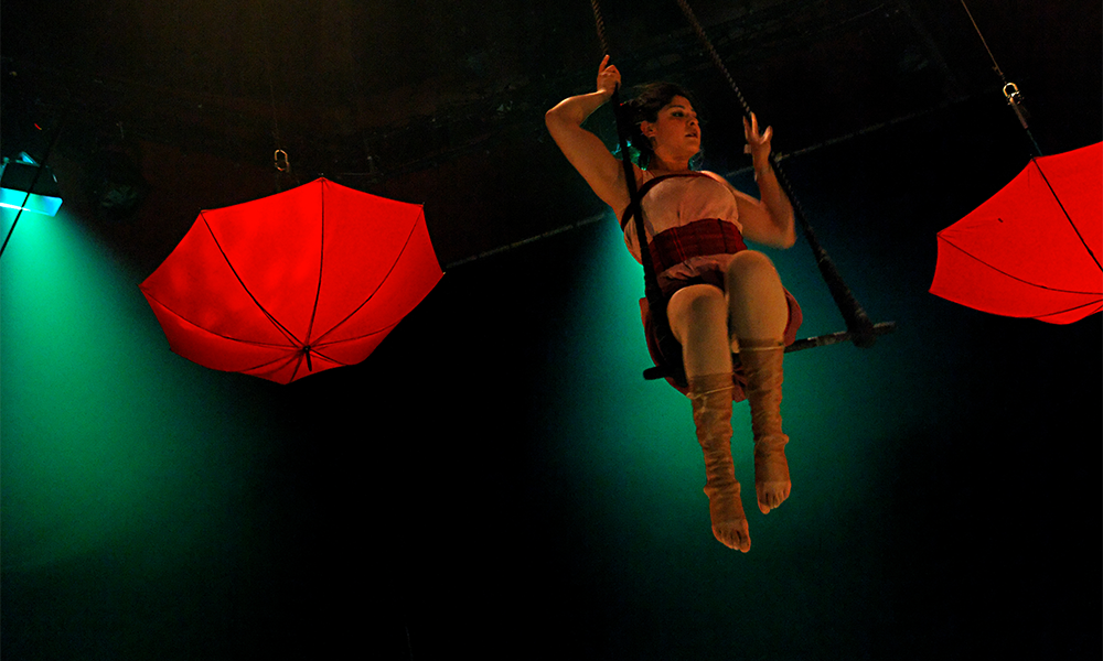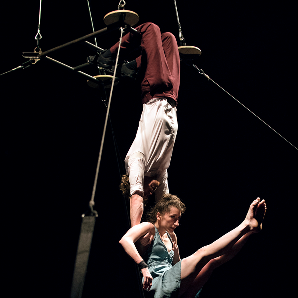 Suspendu par un unique point d’accroche, le trapèze-danse change souvent de hauteur au cours du spectacle pour donner un effet de rotation.