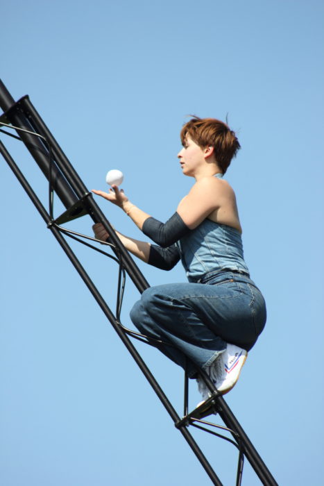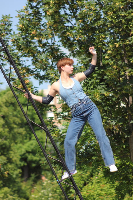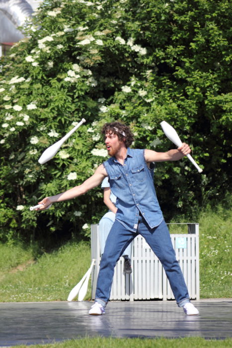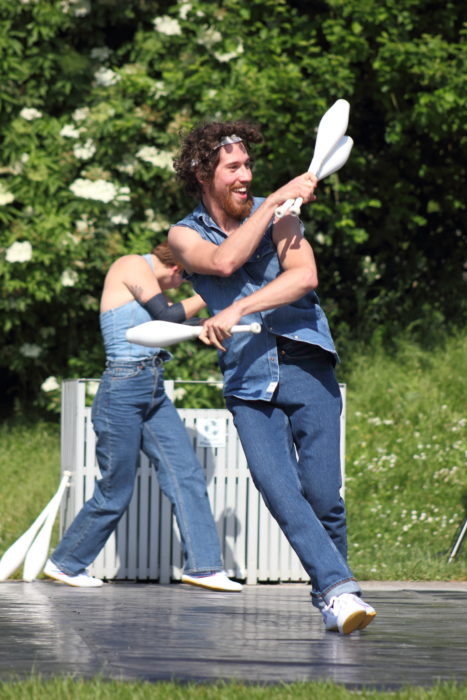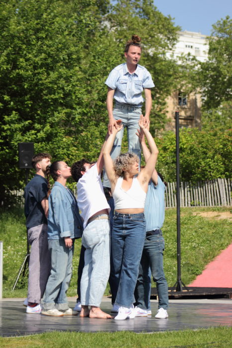avec les apprenti·e·s de deuxième année du CFA des arts du cirque de l’Académie : Nina Castiglia (mât chinois), Louise Hardouin (acrobatie), Jérémy Heudebert (roue Cyr), Daniel Kvasnovsky (corde lisse), Fanny Marmion (cerceau aérien), Tom Neyret (jonglage), Lucie Otter (équilibre) et Dario Rasia (jonglage).