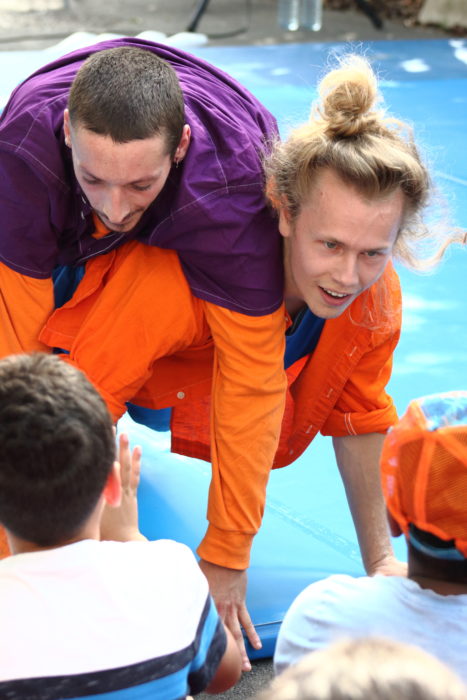 Le 8 juillet 2023 sur la Place Jean-Jaurès, les enfants se sont familiarisés avec les arts du cirque à travers les ateliers animés par les intervenant·es de l'Académie Fratellini, avant de plonger en famille dans l’univers de BasarKus (La Fabuleuse Histoire de Basarkus), une créature flanquée de deux têtes, et de multiples membres.
