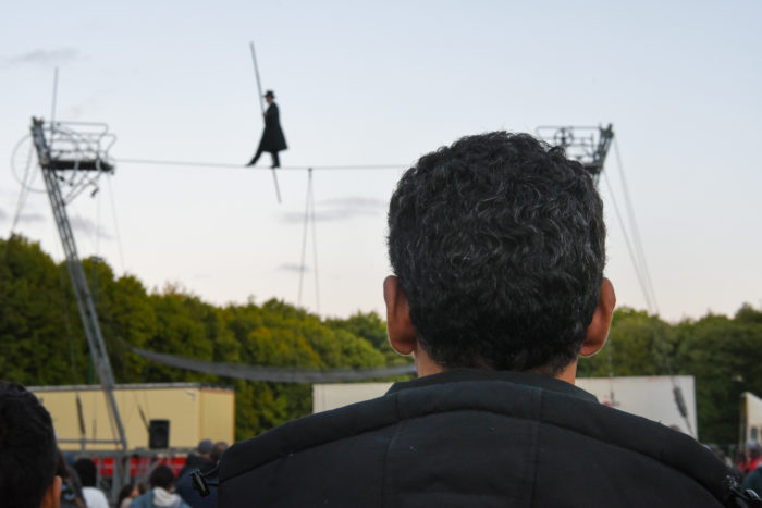©Regards tournés vers le ciel pour suivre le numéro de Didier Pasquette, funambule.