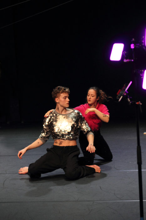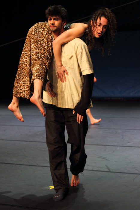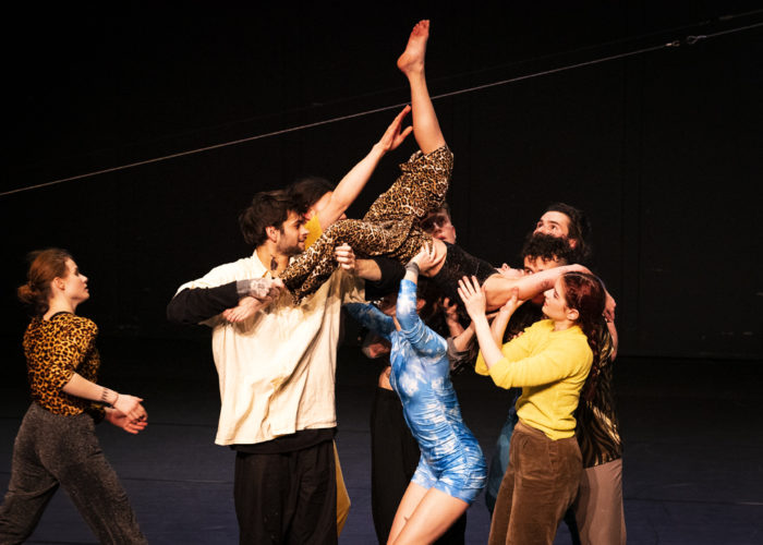 ÈS est une préposition qui signifie « En matière de ». Elle est toujours suivie d’un pluriel et donc d’une multiplicité, comme celle que cherchent depuis 2011, Sidonie Duret, Jeremy Martinez et Emilie Szikora, en œuvrant au sein du collectif à la co-écriture chorégraphique de leurs pièces. Ce questionnement constant autour des notions de collectif et de groupe, trouve ses réponses dans une intensité physique qui pousse les corps à s’engager, à être habités pleinement. Un désir de développer une empathie physique, d’investir des corps qui communiquent et transpirent le plaisir d’être ensemble. Un désir de communion qui se trouve aussi en s’emparant, non sans autodérision, de thématiques telles que l’utopie, le désaccord, le plagiat ou de l’héritage de références populaires. Solliciter les mémoires communes et personnelles que provoquent certaines musiques, événements ou pratiques populaires et les réactualiser par le mouvement. Créer est l’opportunité de se rassembler, d’œuvrer ensemble, de questionner notre rapport à l’autre.