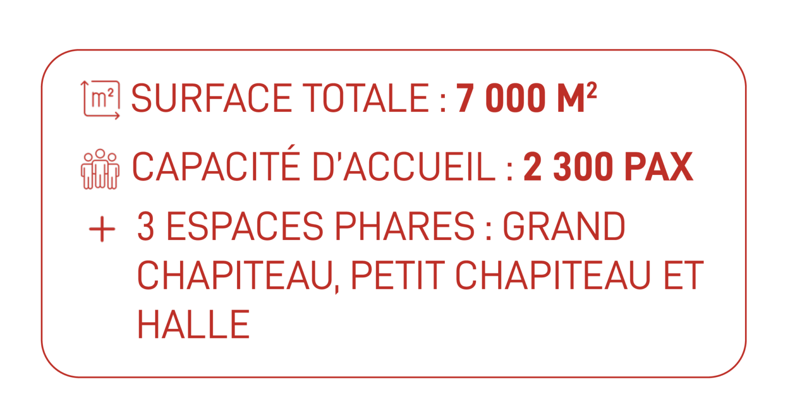 | Grand Chapiteau | 600 | 1200 | 528 + 184 avec les alcôves |