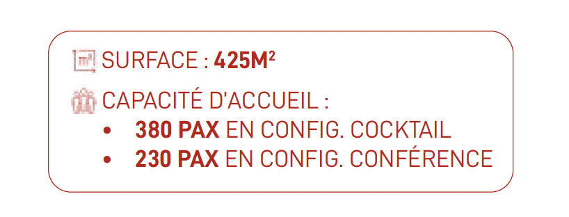 Configurations possibles : séminaires, réunions, sous-commissions, cocktails, dîners assis, cérémonies de voeux, présentation de produits.